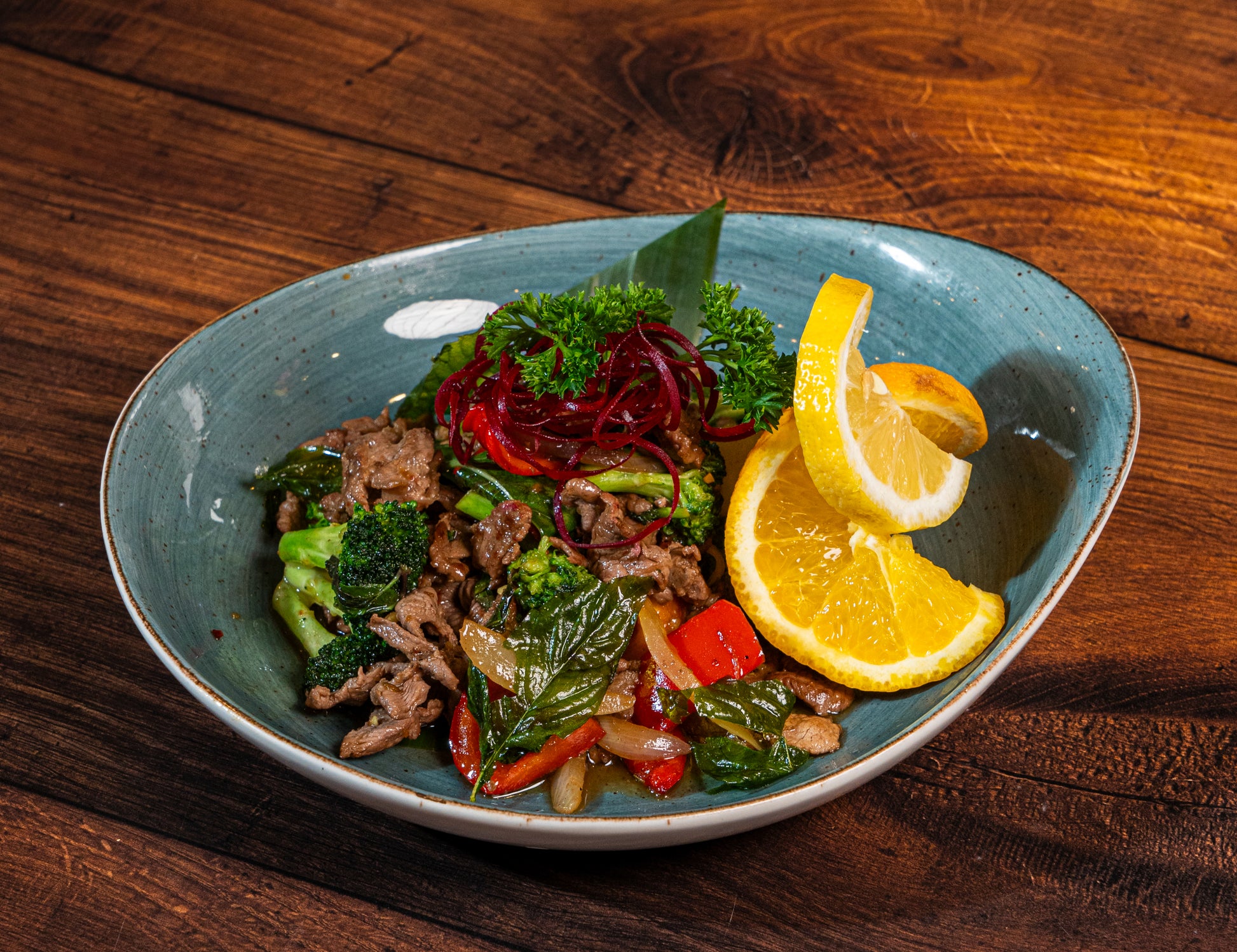 Explore the deep savory flavors of our Thai Basil Beef Stir Fry, a Thai-style recipe to fill your mouth. Crunchy bits of beef are stir-fried with tangy basil leaves, creating a savoury base. It is topped with fresh broccoli, onions, garlic and chili peppers to give a perfect crunch and heat. You add a little lemon to the mix and every bite is divine. Totally adaptable; you can also pair it with tofu, chicken, lamb, shrimp, or seafood.