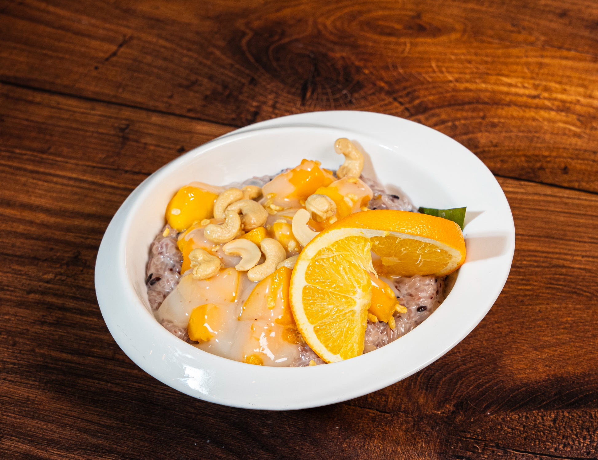 Mango Sticky Rice with Cashew Nuts has a creamy texture from the coconut milk. The rice is chewy and soft since sugar is used the rice becomes sticky. Fresh mangoes give the dish a tropical flavorfulness. The natural flavor of the mango brings a refreshness to the desert as a whole. Cashew nut brings a nutty flavor and a hard texture to the rather soft sticky rice and mango slices.