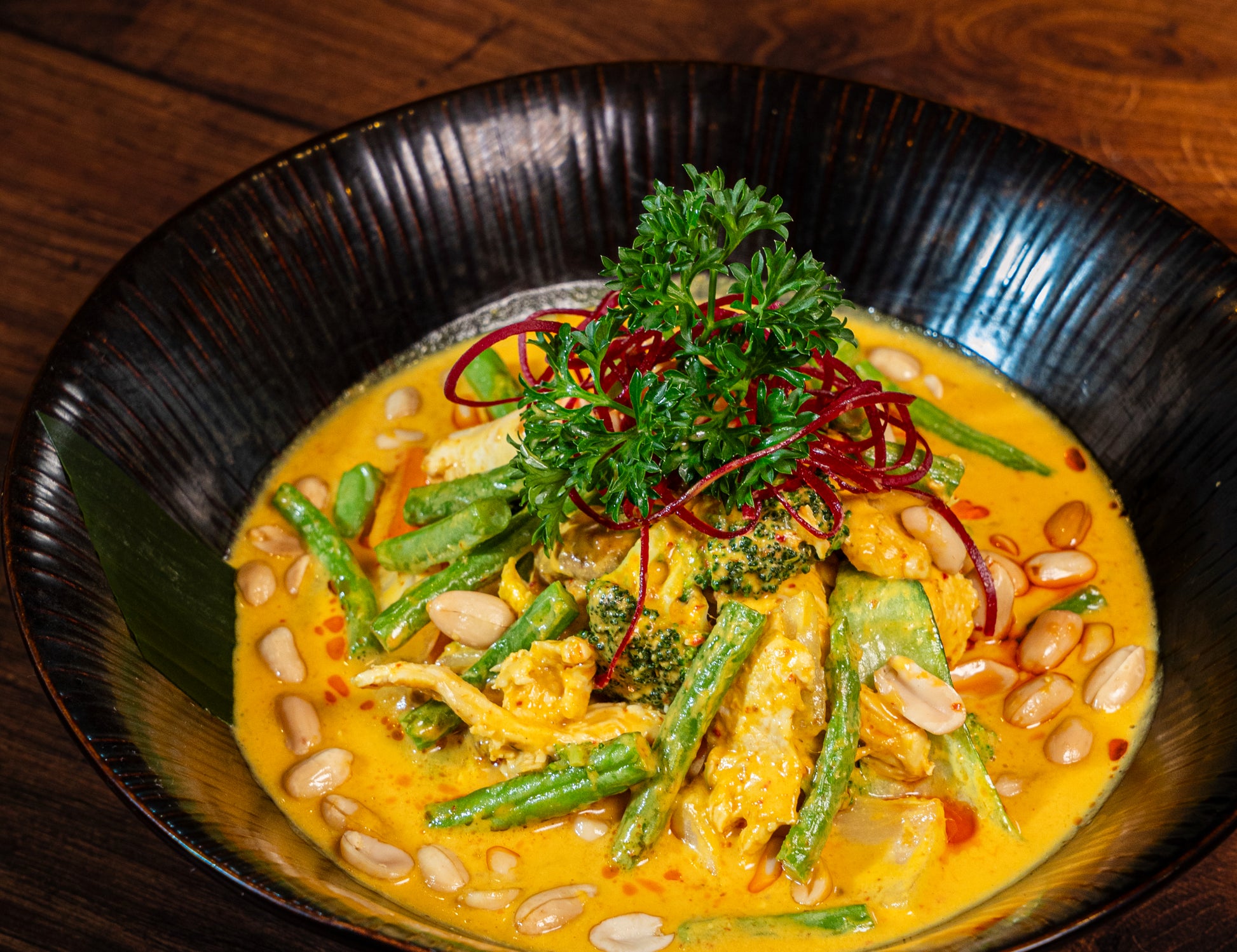 The Panang Curry gives you a perfect harmony of flavours. Thai cuisine Panang curry marries the creamy consistency of coconut milk with the complex flavors of homemade red curry paste and roasted peanuts, giving the creamy sauce a savoury texture. Red peppers and long green beans bring a touch of sweetness and freshness, while the lime leaf adds a nice bite. Every bite of this Thai-inspired curry is an invitation to taste the tums of Thailand, and it is the food to quench your thirst for bold flavours.